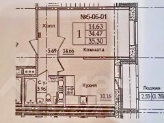 Общая площадь: 35,3 м². Комната: 14,4 м². Кухня: 10,2 м² с выходом на застекленную лоджию 2,6 м².