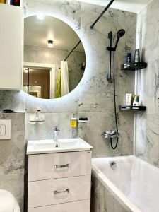 Отделка высочайшего качества, все новое! Бесшумный 2х-камерный холодильник, дорогой кондиционер!, раскладной диван с единым спальным местом, элегантная дорогая кухня, качественная сантехника и вся бытовая техника. Освещение дизайнерское, с зонированием.