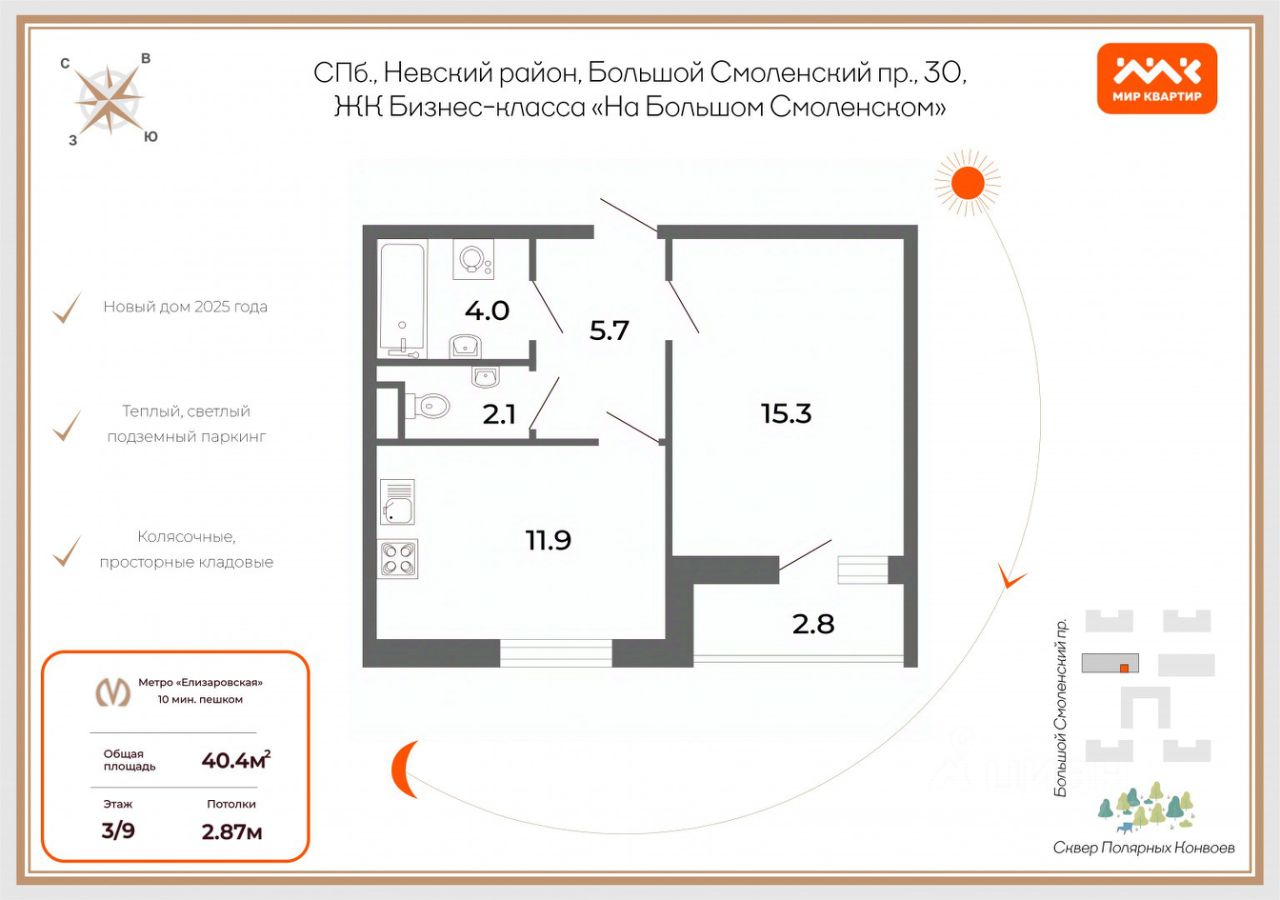 Арт. 119715246 Жилой комплекс "На Большом Смоленском" расположен в Невском районе Петербурга, всего в нескольких минутах ходьбы от метро "Елизаровская". Район активно развивается: здесь строятся современные жилые комплексы, появляются новые парки и объекты инфраструктуры, что делает локацию всё более привлекательной для жизни и инвестиций. До Невского проспекта на автомобиле всего 9 минут.