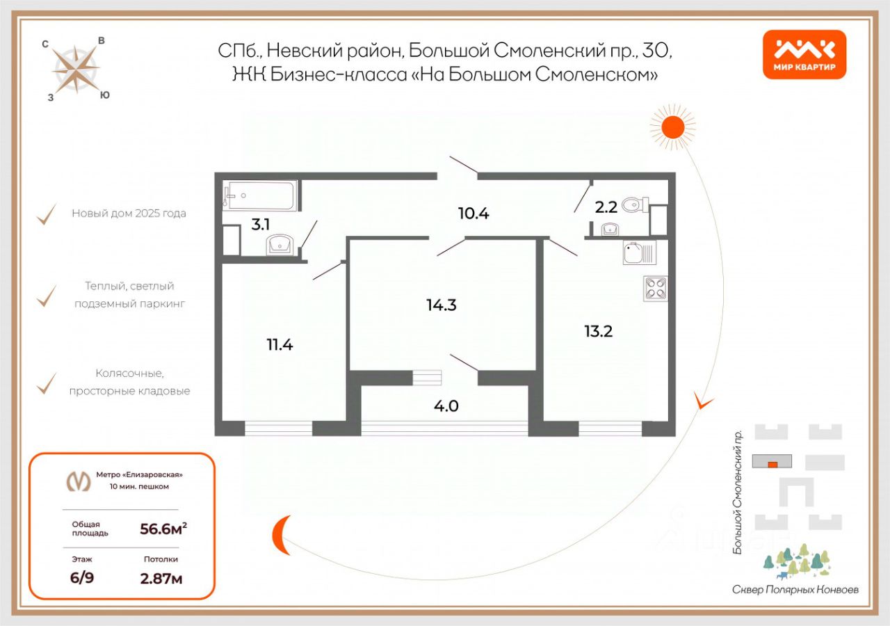 Арт. 119720494 Жилой комплекс "На Большом Смоленском" расположен в Невском районе Петербурга, всего в нескольких минутах ходьбы от метро "Елизаровская". Район активно развивается: здесь строятся современные жилые комплексы, появляются новые парки и объекты инфраструктуры, что делает локацию всё более привлекательной для жизни и инвестиций. До Невского проспекта на автомобиле всего 9 минут.
