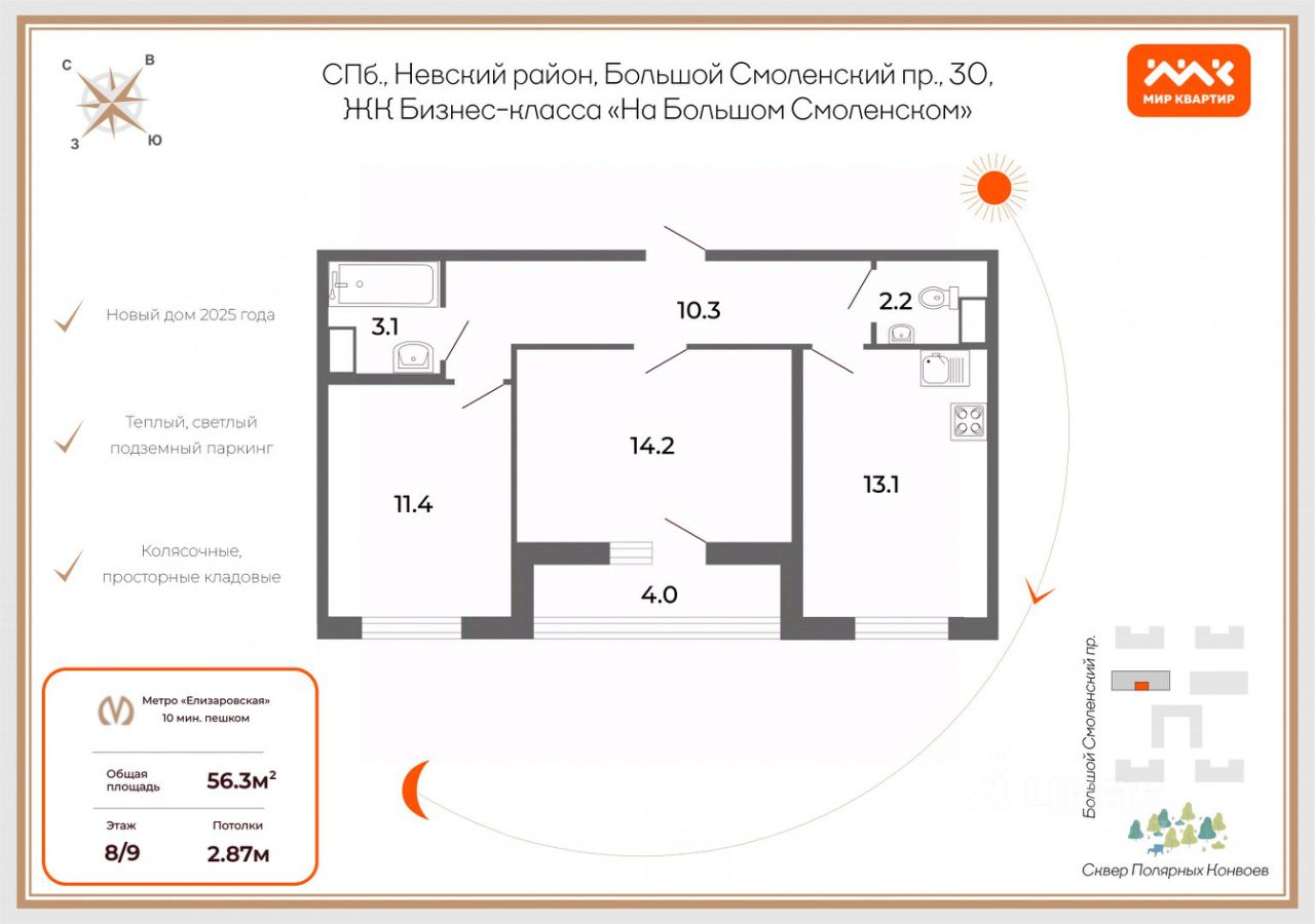 Арт. 119721100 Жилой комплекс "На Большом Смоленском" расположен в Невском районе Петербурга, всего в нескольких минутах ходьбы от метро "Елизаровская". Район активно развивается: здесь строятся современные жилые комплексы, появляются новые парки и объекты инфраструктуры, что делает локацию всё более привлекательной для жизни и инвестиций. До Невского проспекта на автомобиле всего 9 минут.