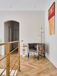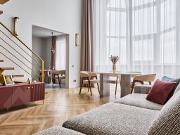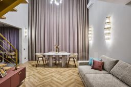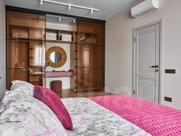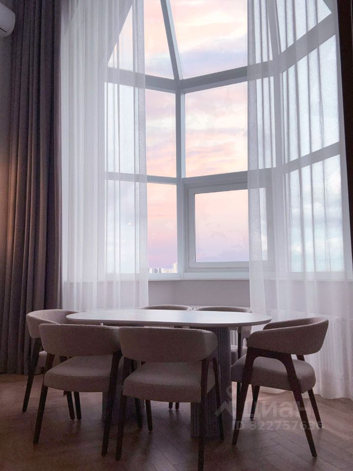 Квартира находится на 17,18 этажах. Просторная атмосферная гостиная с потолками 5,70 м, уютная спальня с гардеробной, 5 изолированных комнат, три санузла, постирочная.