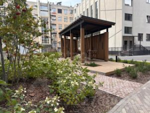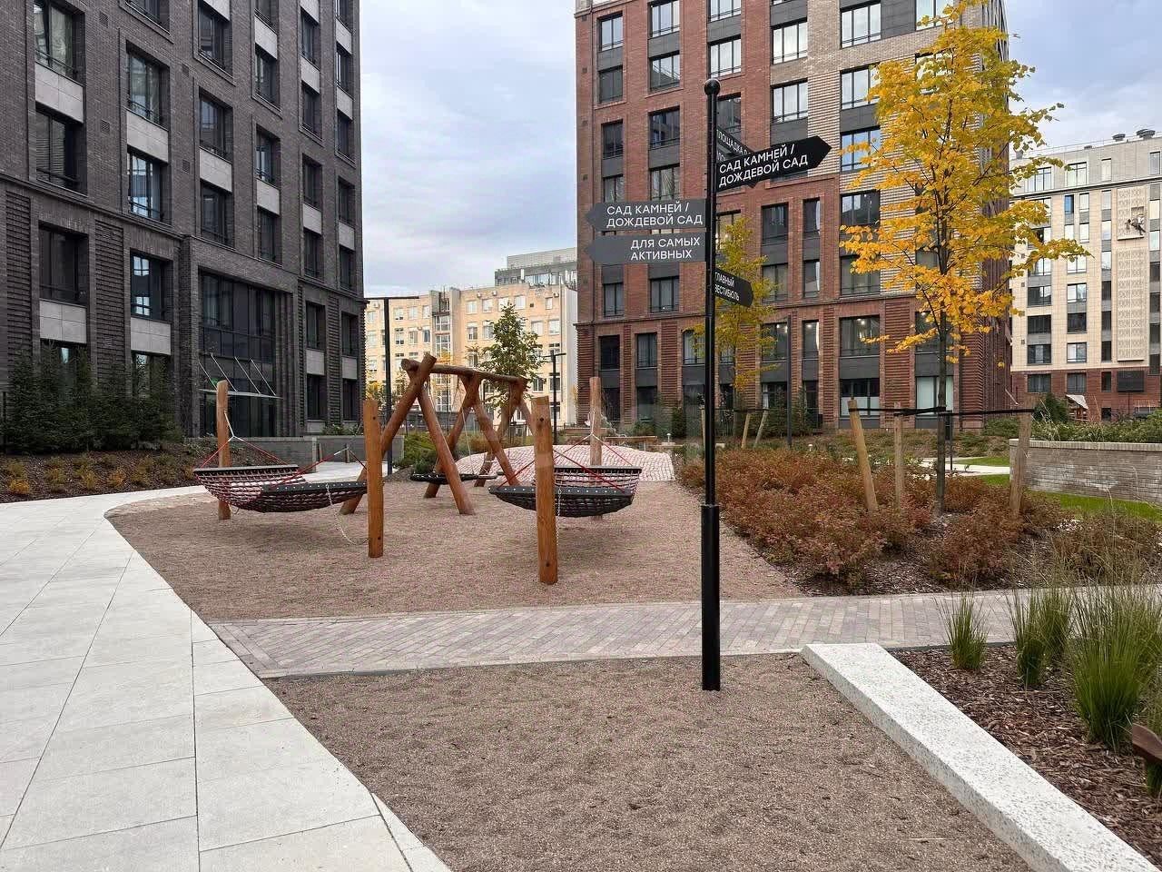 Главный вход в ЖК с зоной ожидания и стойкой ресепшен. Особое внимание в этом проекте уделено ландшафтному дизайну и интерьерам мест общего пользования. Закрытая территория жилого комплекса с разнообразными площадками для детей разных возрастов и местами для отдыха и занятий спортом. В каждой парадной предусмотрена колясочная и место для хранения велосипедов. В лифтовом холле и на первом этаже установлены диджитал-экраны с системой информирования о событиях и новостях управляющей компании.