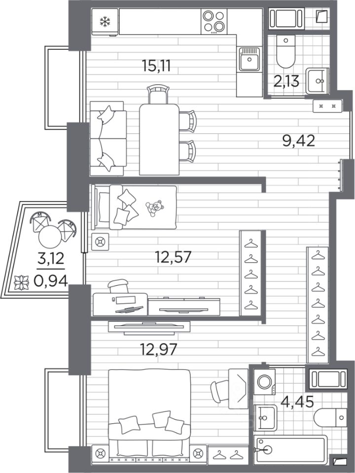 Продаётся 2-комнатная квартира в строящемся доме (Дом 3), срок сдачи: IV-кв. 2027, общей площадью 57.59 кв.м., на 12 этаже. Жилой квартал Respect - современная респектабельность.