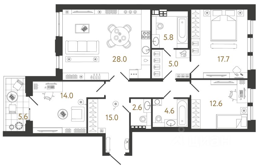 Средняя площадь квартир в проекте - 85,3 м. В коллекционной квартирографии выделяются исключительные лоты: 9 квартир с люкарнами и террасами, 4 из которых - двухуровневые, 2 из них - с двусветной гостиной и потолками до 6,4 м. В башнях-доминантах, которые проглядываются с Каменноостровского проспекта, ещё две уникальные квартиры: здесь потолки в кухне-гостиной достигают высоты 3,75 м. Все квартиры продаются без отделки. Окна и балконы - алюминиевые с накладками из натурального дерева внутри квартиры.