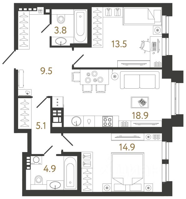 Средняя площадь квартир в проекте - 85,3 м. В коллекционной квартирографии выделяются исключительные лоты: 9 квартир с люкарнами и террасами, 4 из которых - двухуровневые, 2 из них - с двусветной гостиной и потолками до 6,4 м. В башнях-доминантах, которые проглядываются с Каменноостровского проспекта, ещё две уникальные квартиры: здесь потолки в кухне-гостиной достигают высоты 3,75 м. Все квартиры продаются без отделки. Окна и балконы - алюминиевые с накладками из натурального дерева внутри квартиры.