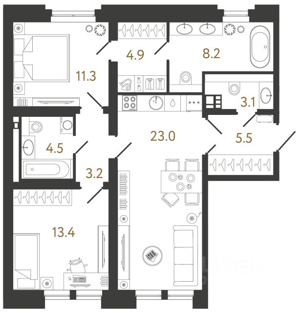 Средняя площадь квартир в проекте - 85,3 м. В коллекционной квартирографии выделяются исключительные лоты: 9 квартир с люкарнами и террасами, 4 из которых - двухуровневые, 2 из них - с двусветной гостиной и потолками до 6,4 м. В башнях-доминантах, которые проглядываются с Каменноостровского проспекта, ещё две уникальные квартиры: здесь потолки в кухне-гостиной достигают высоты 3,75 м. Все квартиры продаются без отделки. Окна и балконы - алюминиевые с накладками из натурального дерева внутри квартиры.