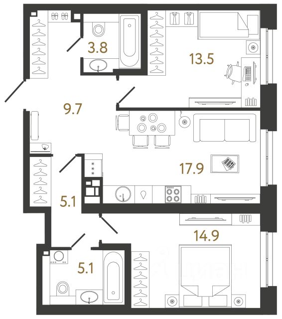 Средняя площадь квартир в проекте - 85,3 м. В коллекционной квартирографии выделяются исключительные лоты: 9 квартир с люкарнами и террасами, 4 из которых - двухуровневые, 2 из них - с двусветной гостиной и потолками до 6,4 м. В башнях-доминантах, которые проглядываются с Каменноостровского проспекта, ещё две уникальные квартиры: здесь потолки в кухне-гостиной достигают высоты 3,75 м. Все квартиры продаются без отделки. Окна и балконы - алюминиевые с накладками из натурального дерева внутри квартиры.