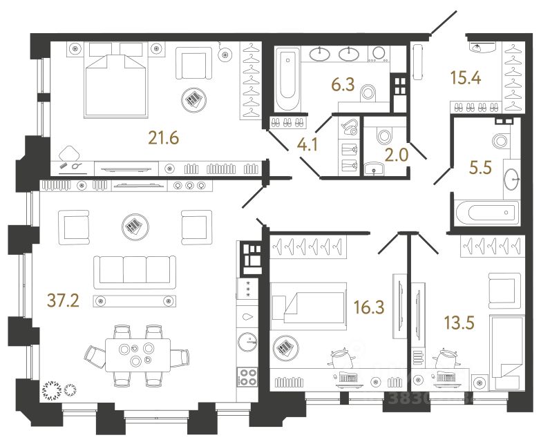 Средняя площадь квартир в проекте - 85,3 м. В коллекционной квартирографии выделяются исключительные лоты: 9 квартир с люкарнами и террасами, 4 из которых - двухуровневые, 2 из них - с двусветной гостиной и потолками до 6,4 м. В башнях-доминантах, которые проглядываются с Каменноостровского проспекта, ещё две уникальные квартиры: здесь потолки в кухне-гостиной достигают высоты 3,75 м. Все квартиры продаются без отделки. Окна и балконы - алюминиевые с накладками из натурального дерева внутри квартиры.