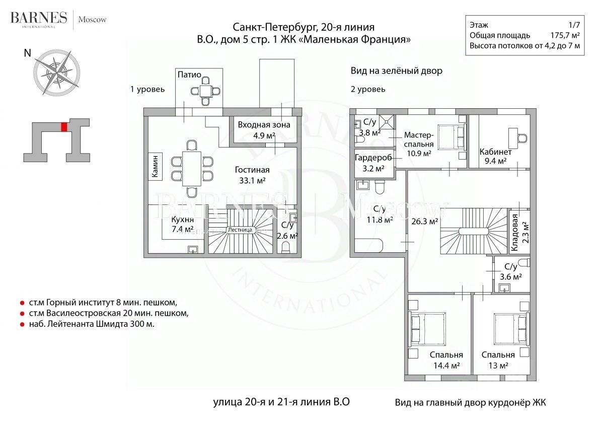 Трехуровневая квартира начинается с -1 этажа вы попадаете в свою квартиру через отдельный вход, расположенный прямо у ваших машиномест в подземном паркинге. Или заходите в резиденцию через закрытый зеленый двор, украшенный гортензиями. На первом уровне вас встречает большая кухня-гостиная с дровянным камином и выходом на собственное патио здесь можно насладиться чашечкой кофе летом или слепить снеговика вместе с детьми. В квартире предусмотрено три санузла, один из которых расположен на первом этаже, а второй предполагает мето для сауны или хамама. На втором уровне расположились четыре спальни: мастер-спальня с гардеробной и санузлом с окном и кабинет выходят в тихий красивый двор, две детские в нарядный двор-курдонер с фонтаном. Да, это та самая двухсторонняя планировка, о которой вы мечтали.