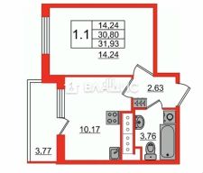 - Метраж 30.4 м + балкон 3.77 м, потолок 2,75м