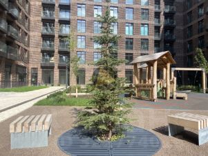 - Жилой комплекс находится под круглосуточным видеонаблюдением и имеет собственный зеленый парк во дворе без доступа для автомобилей. Для автовладельцев предусмотрен подземный паркинг со станциями для зарядки электромобилей