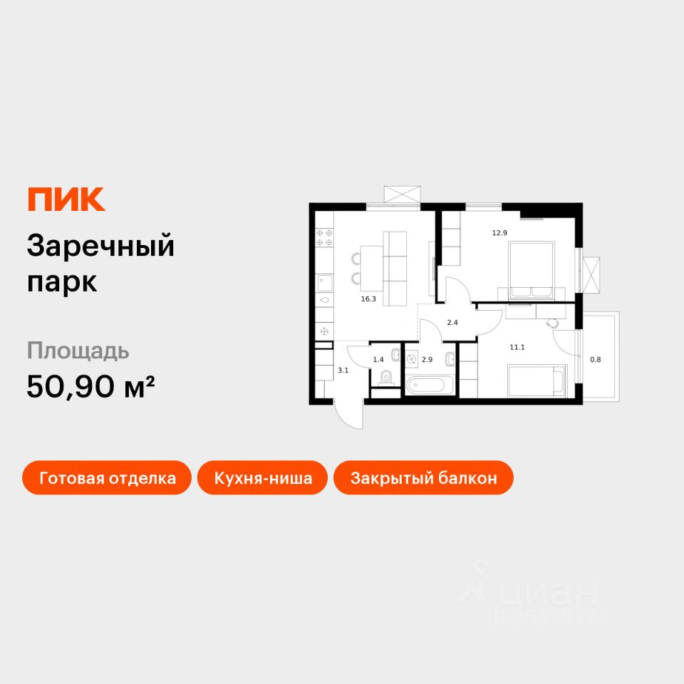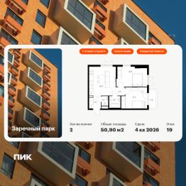 Продаётся 2-комн. квартира площадью 50,9 кв.м на 19 этаже 24 этажного дома (Корпус 6, Секция 2) проекта ПИК Заречный парк. Светлый просторный подъезд на уровне земли, функциональная планировка, большие окна, c отделкой.