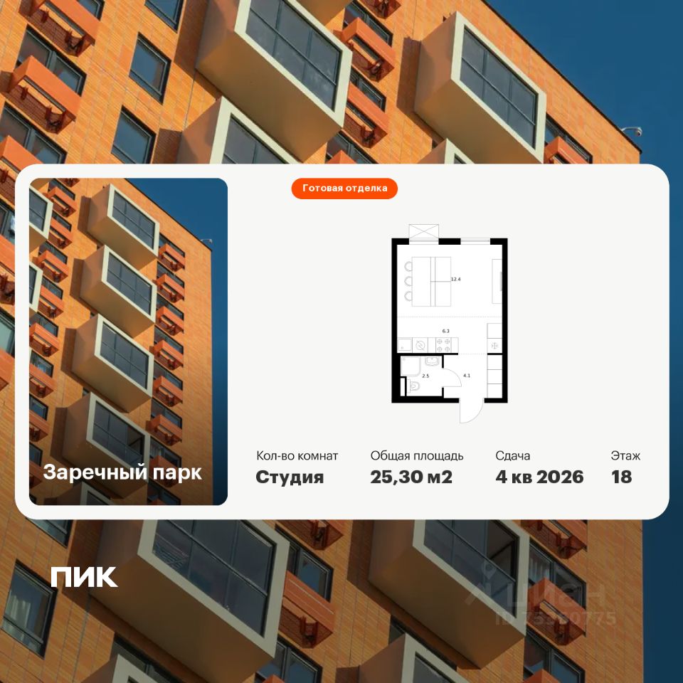 Продаётся квартира-студия площадью 25,3 кв.м на 18 этаже 24 этажного дома (Корпус 6, Секция 2) проекта ПИК Заречный парк. Светлый просторный подъезд на уровне земли, функциональная планировка, большие окна, c отделкой.