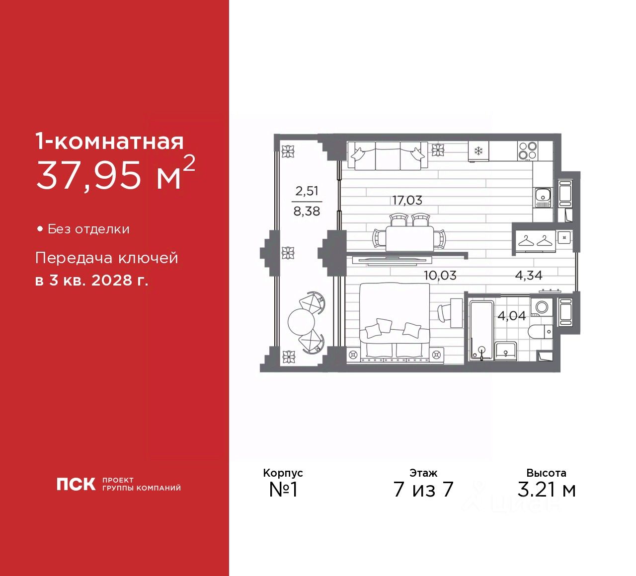 1-комн. квартира в Клубный квартал "Ассамблея" на 7 этаже. Квартира без отделки, новый владелец может сделать ремонт по своему проекту. Общая площадь: 37.95 кв.м. Высота потолков 3.21 м.