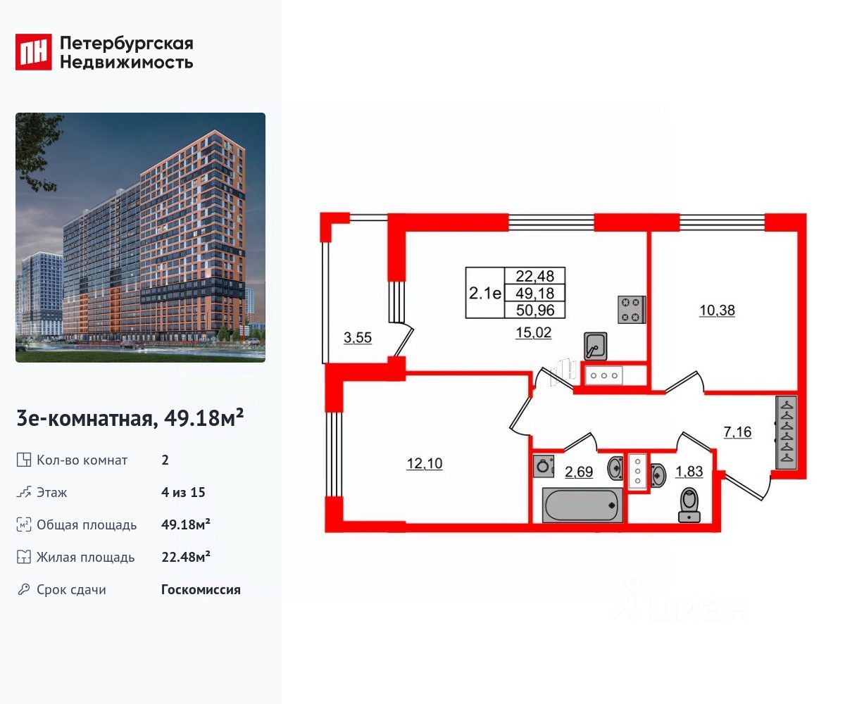 Удобная, классическая, функциональная европланировка, большая кухня-гостиная 15.02 м², вместительная прихожая 7.16 м². Общая площадь квартиры - 49.18 м², жилая 22.48 м², высота потолка 2.77 м.