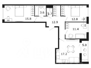 Очень много пространства: большая кухня-гостинная, три изолированные спальни, гардеробная, два с/у, большая лоджия.
