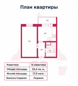 В продаже полностью готовая к жизни 1-комнатная квартира площадью 33,4 м².