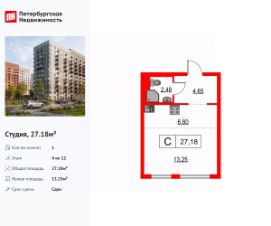 Удобная, классическая, функциональная европланировка, большая кухня-гостиная 6.8 м², просторная прихожая 4.65 м². Общая площадь студии - 27.18 м², жилая 13.25 м², высота потолка 2.68 м.