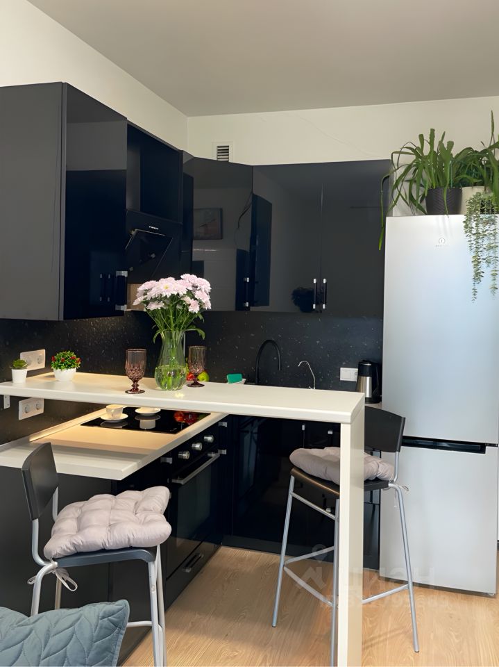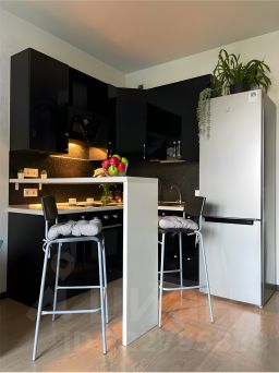 В квартире хороший кухонный гарнитур, оснащен современной техникой. Большая лоджия утеплена, может использоваться как кабинет, спальня или мини-гостиная. На лоджии встроен вместительный шкаф.