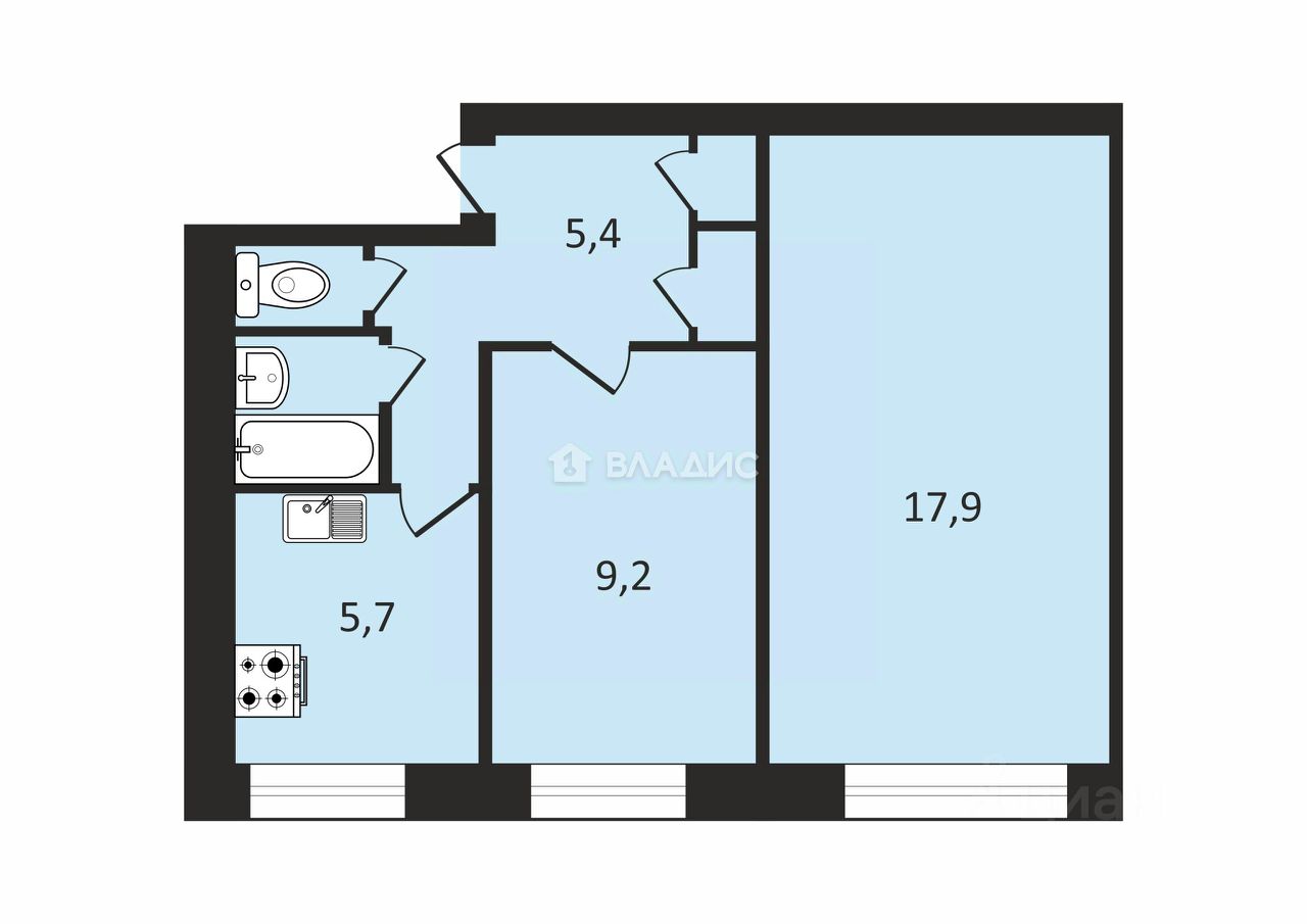 Квартира расположена на втором этаже семиэтажного панельного дома 1963 года постройки по адресу: проспект Маршала Блюхера, 44к1. Общая площадь составляет 41,5 кв. м, из которых 27,1 кв. м — жилая площадь, а 5,7 кв. м — кухня. Высота потолков — 2,5 м, комнаты изолированные, окна выходят во двор.