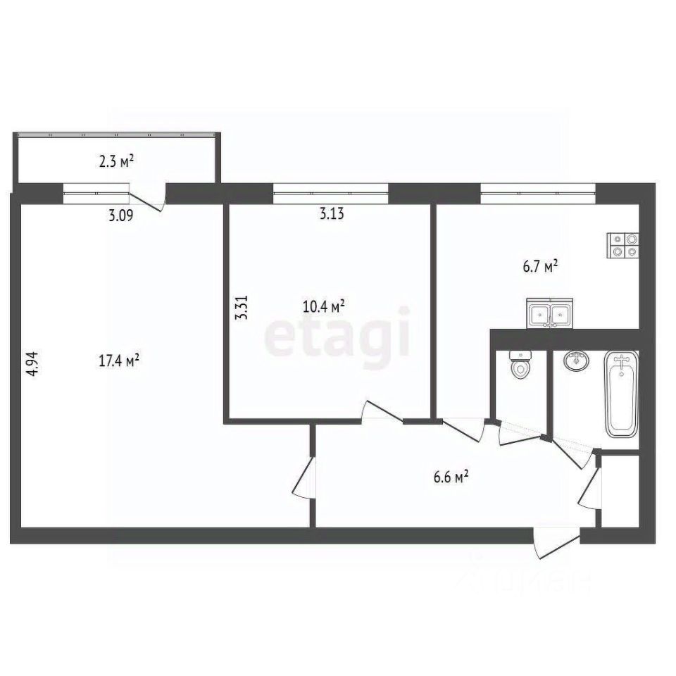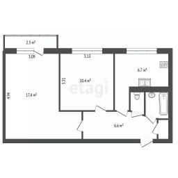 • Комнаты: 17.4 м² (с выходом на балкон 2.4 м²) + 10.4 м²