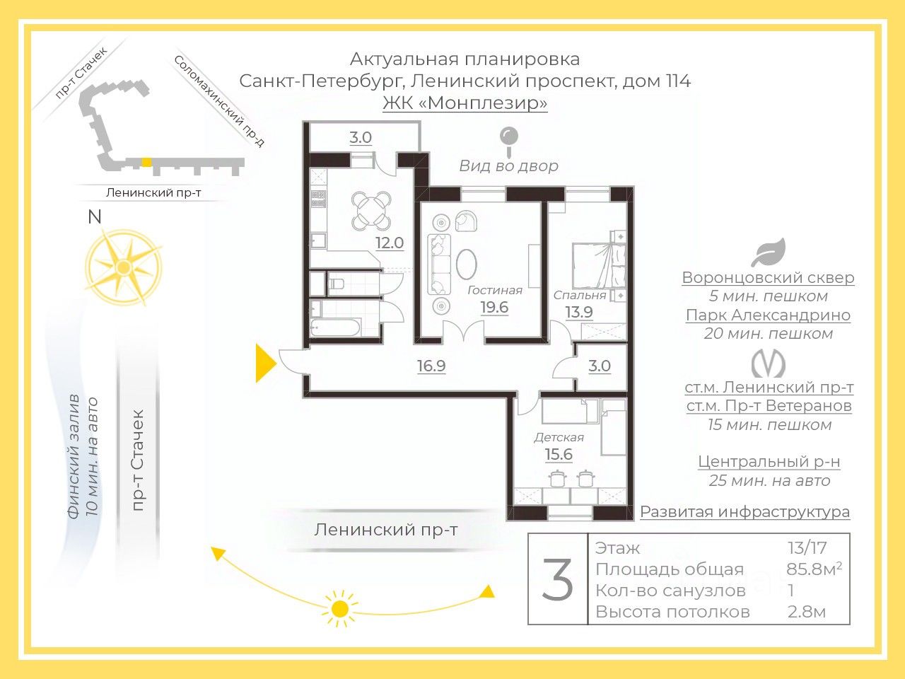 Арт. 119944572 В продаже просторная, уютная 3-х комнатная квартира в ЖК Монплезир на Ленинском проспекте. Это идеальное предложение для тех кто ценит удобство расположения, комфорт и уют.