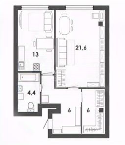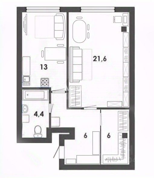 Общая площадь квартиры 51 кв.м., жилая 21,6 кв.м., кухня 13 кв.м. Имеется гардеробная 6 кв.м.