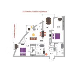 Панорамные окна квартиры выходят на улицу Солнечную и в сторону Константиновского проспекта.