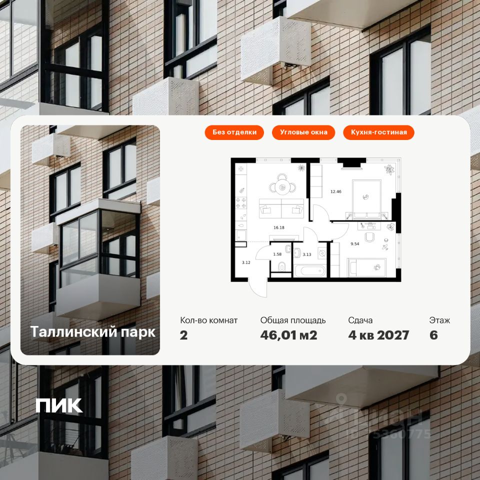 Продаётся 2-комн. квартира площадью 46,01 кв.м на 6 этаже 12 этажного дома (Корпус 4.2, Секция 1) проекта ПИК Таллинский парк. Светлый просторный подъезд на уровне земли, функциональная планировка, большие окна, без отделки.