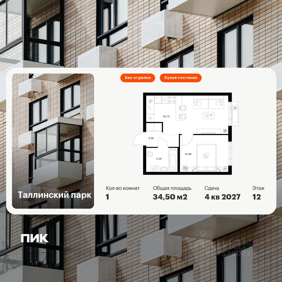 Продаётся 1-комн. квартира площадью 34,5 кв.м на 12 этаже 12 этажного дома (Корпус 4.2, Секция 1) проекта ПИК Таллинский парк. Светлый просторный подъезд на уровне земли, функциональная планировка, большие окна, без отделки.