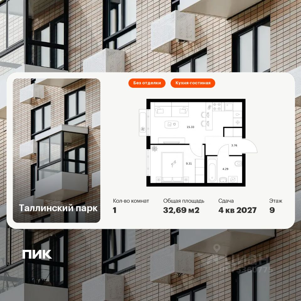 Продаётся 1-комн. квартира площадью 32,69 кв.м на 9 этаже 12 этажного дома (Корпус 4.2, Секция 1) проекта ПИК Таллинский парк. Светлый просторный подъезд на уровне земли, функциональная планировка, большие окна, без отделки.
