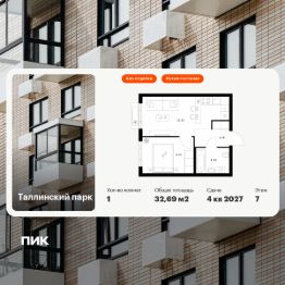 Продаётся 1-комн. квартира площадью 32,69 кв.м на 7 этаже 12 этажного дома (Корпус 4.2, Секция 1) проекта ПИК Таллинский парк. Светлый просторный подъезд на уровне земли, функциональная планировка, большие окна, без отделки.
