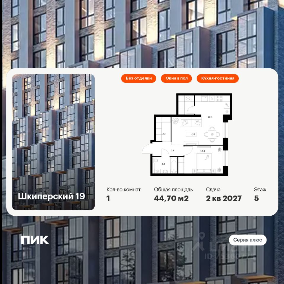 Продаётся 1-комн. квартира площадью 44,7 кв.м на 5 этаже 8 этажного дома (Корпус 2, Секция 3) проекта ПИК Шкиперский 19. Светлый просторный подъезд на уровне земли, функциональная планировка, большие окна, без отделки.