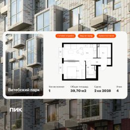Продаётся 1-комн. квартира площадью 39,7 кв.м на 4 этаже 12 этажного дома (Корпус 6, Секция 4) проекта ПИК Витебский парк. Светлый просторный подъезд на уровне земли, функциональная планировка, большие окна, c отделкой.