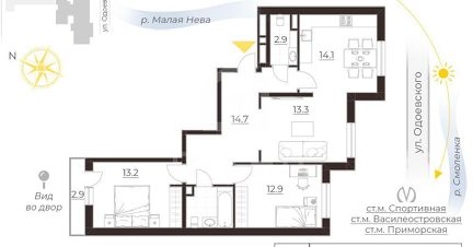 Планировка: три комнаты (13,3 м², 12,9 м², 13,2 м²), кухня (14,1 м²), холл (14,7 м²), две ванные комнаты (4,2 м² и 2,9 м²), лоджия (2,9 м²).