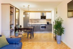 Квартира светлая и уютная, окна выходят на южную сторону, созданы все условия для комфортного проживания. Гостиная просторная, с удобной кухонной зоной.