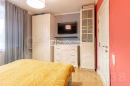 В спальне есть двуспальная кровать, вместительный шкаф, комод. На окнах жалюзи, ортопедический матрас. В прихожей обустроена закрытая гардеробная.