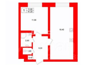 Общая площадь квартиры составляет 41,2 м2, из них жилая - 29,4 м2 (комнаты - 18,4 м2 и 11 м2).