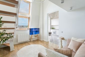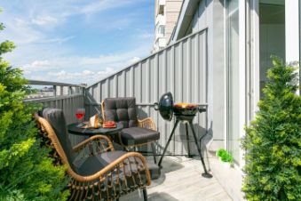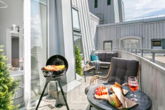 В квартире две большие отдельные гардеробные, просторная кухня-гостиная 19 м² с выходом на большую уютную террасу с мебелью для отдыха и электрическим барбекю Tefal.