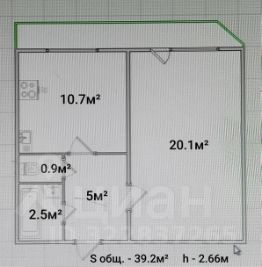 Комната 20.1м², кухня 10.7м², прихожая 5м². Балкон длиной 6.6м.