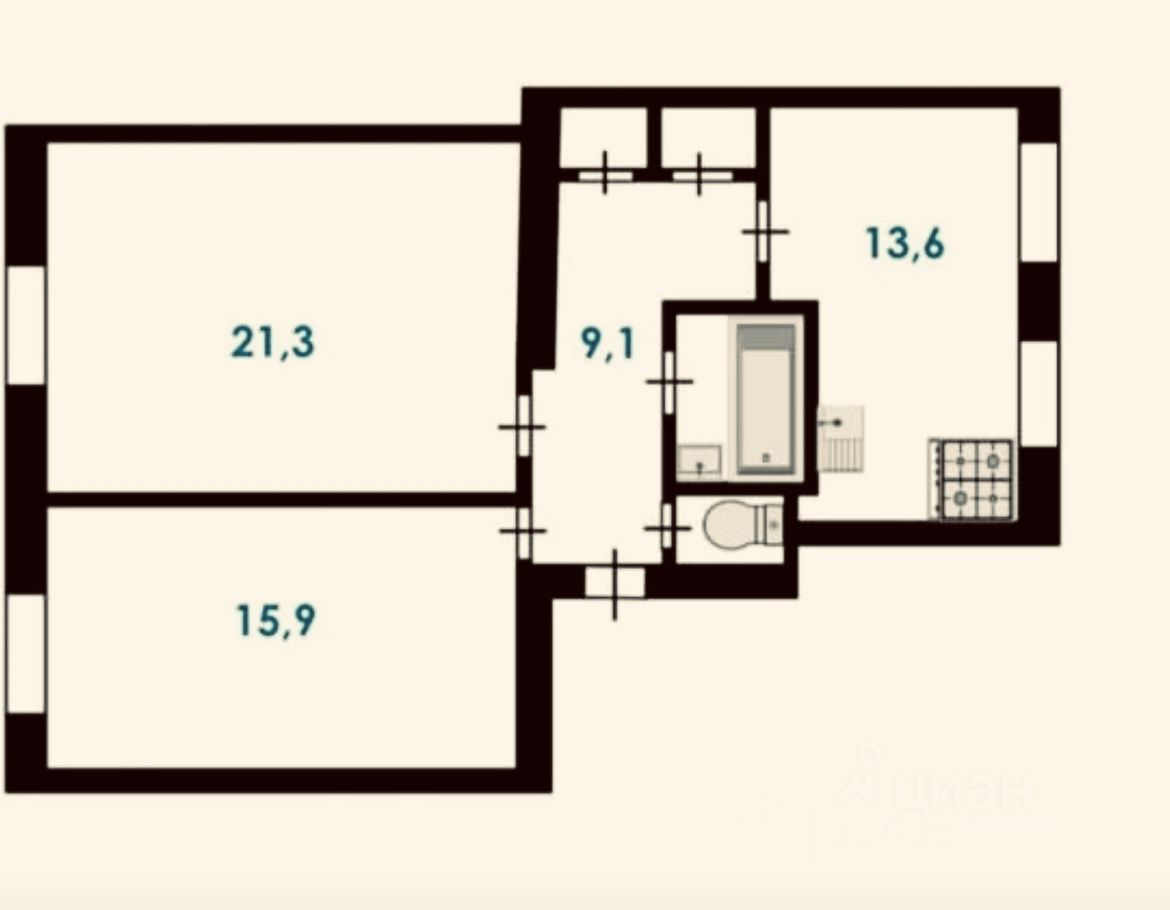 Жилая площадь состоит из двух изолированных комнат 21,3+15,9 квадратных метров, позволяющая свободно разместить мебель и создать удобное пространство для жизни. Кухня площадью 13.6 квадратных метров предоставит достаточно места для кулинарного творчества и семейных ужинов, а просторный холл 9,1кв.м. позволит разместить большой шкаф-купе.
