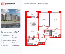 Уникальная, функциональная европланировка, большая кухня-гостиная 18.05 м², вместительная прихожая 8.01 м². Общая площадь квартиры - 66.71 м², жилая 26.63 м², высота потолка 2.77 м.