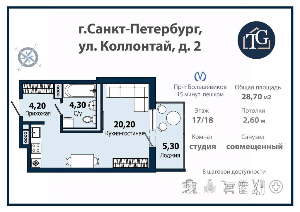 В продаже уютная студия с эргономичной планировкой в ЖК Коллонтай, 2.