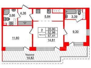 Общая площадь с террасой — 67,88 м², жилая — 52,96 м².