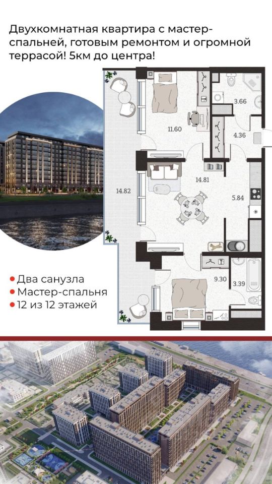 Квартира расположена на 12 этаже из 12, с панорамным остеклением и просторной видовой террасой 14,82 м².