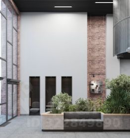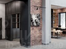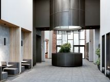 Единая дизайн-концепция продолжается в лобби дома. Сочетание тёплого кирпича с холодным металлом и стеклом создаёт харизматичное, брутальное настроение интерьера парадной группы. Чёткость вертикальных объёмов смягчается округлыми формами стойки ресепшн и декоративных куртин, а большие витражные окна создают иллюзию бесконечности пространства.
