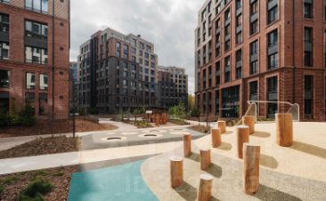 Разнофактурные фасады притягивают внимание и придают кварталу свой неповторимый характер. Каждую секцию хочется рассматривать как отдельный самодостаточный элемент, при этом все вместе они образуют законченную гармоничную композицию.