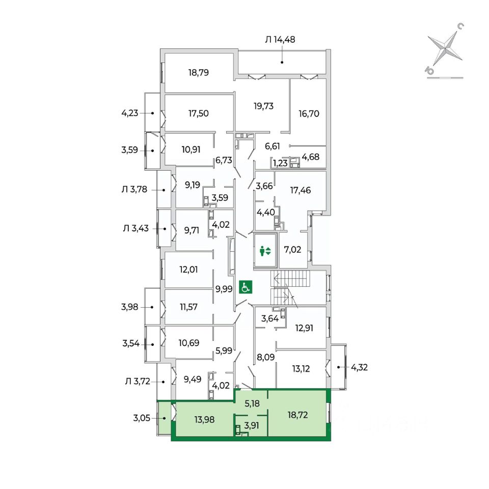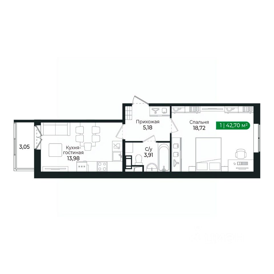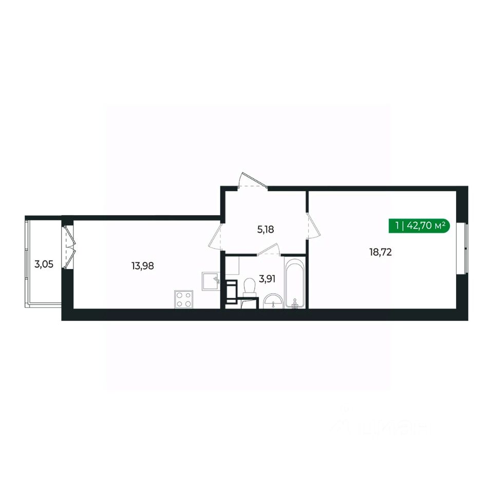 Кухня с балконом и комната (18м2) разделены прихожей и санузлом и имеют правильную геометрию.