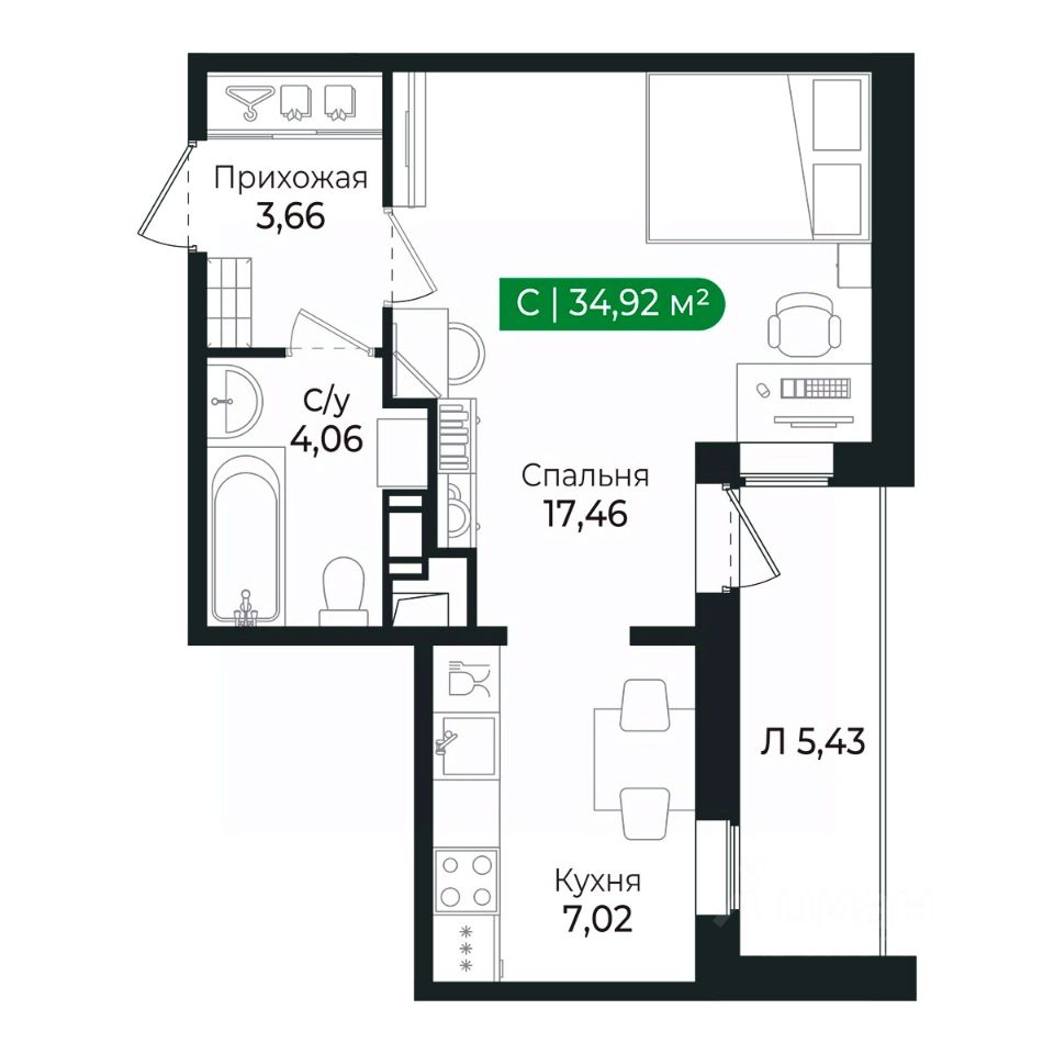 Система хранения располагается в прихожей, кухня помещается в нише, а полноценная спальня правильной формы.